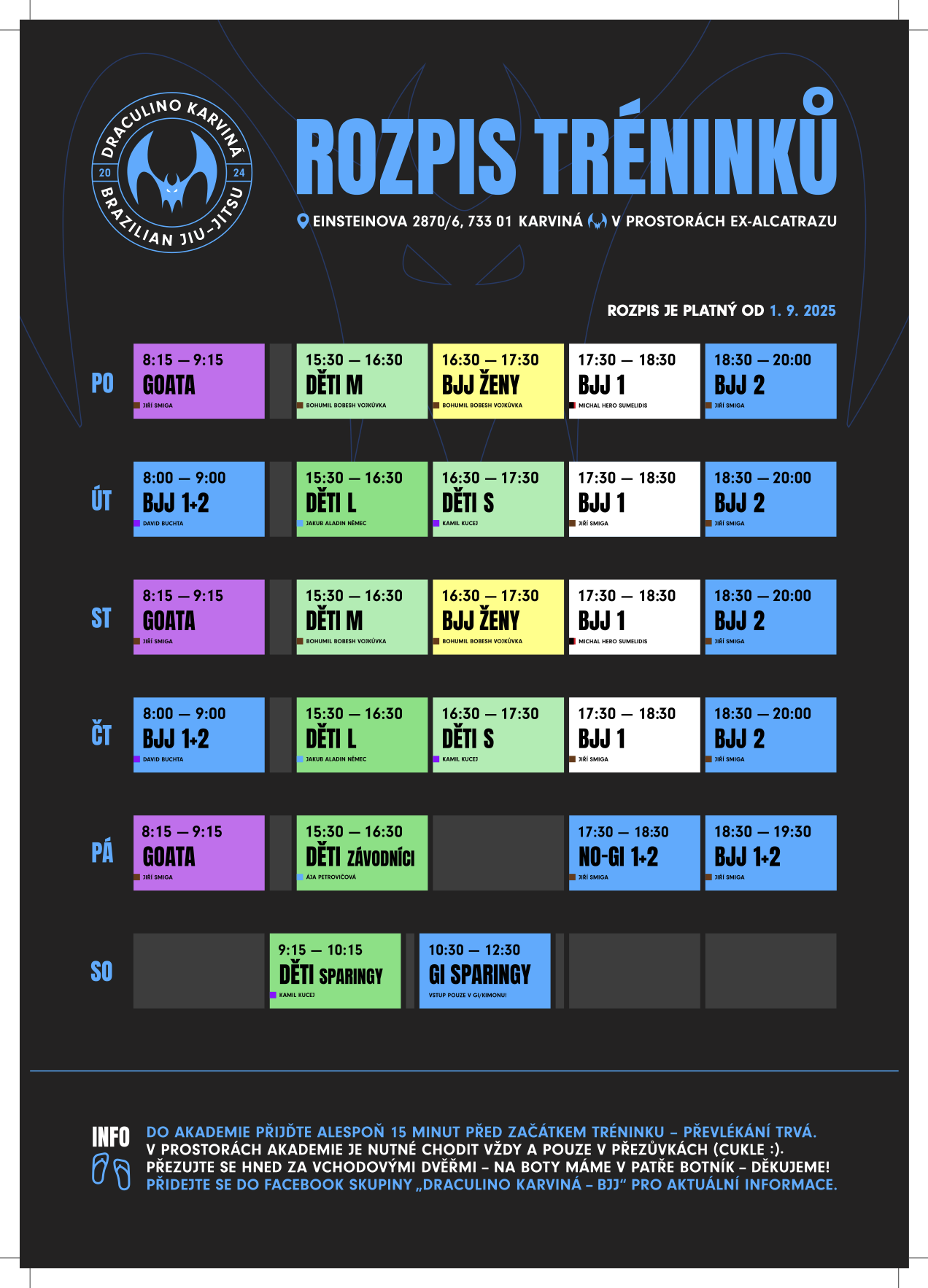 Frýdek-Místek je hlavní centrála českého Draculino týmu. Od roku 2009 se zde oficiálně věnujeme brazilskému jiu-jitsu. Děláme jak tradiční formu v kimonu (BJJ), tak moderní bez kimon (grappling). Mezi našimi kurzy naleznete i kondiční box/kickbox. Smícháním vám vyjde MMA, kterému se také věnujeme. Pokud vás nezajímá boj, tak je zde trénink pro zdraví a dlouhověkost sestávající se ze silového tréninku a jógy. Tréninky jiu-jitsu jsou také pro děti od 4 let v různých věkových skupinách. Aktivně se účastníme zápasů v BJJ a grapplingu. Organizujeme mezinárodní turnaje v jiu-jitsu, semináře a kempy pro dospělé i pro děti. V našem týmu jsou jak závodníci, tak hobíci všech věkových skupin včetně žen. Trénují u nás celé rodiny za zvýhodněnou cenu.